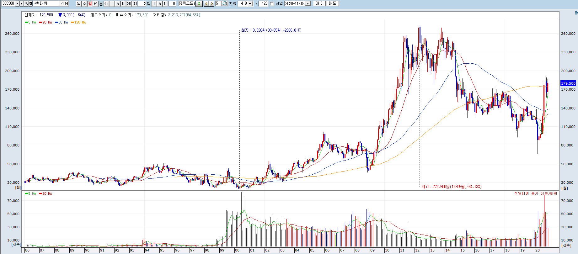 현대차의 1986년부터의 월봉이다. 현대차는 1974년 6월 상장이래 2000년까지 1만원에서 5만원까지 등락을 거듭하다가 2000년 5월 8,520원으로 최저가를 찍었다. 그 후 파란만장한 굴곡을 거치면서 2012년 5월 272,500원에 최고가를 찍은후 현재 18만원선에 있다. 최저가 대비 최고가기준 32배정도의 수익이 날 수 있었지만, 매매시점에 따라 손실도 많이 보았을 수도 있다.